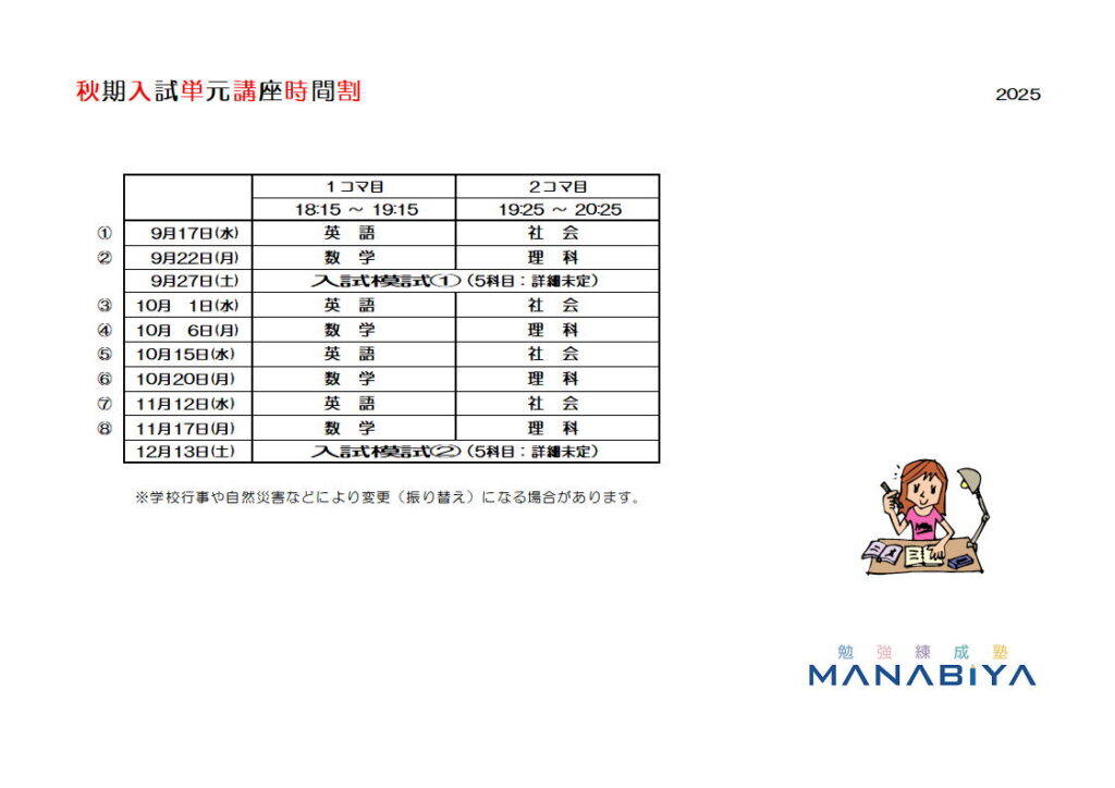 神奈研MANABIYAでは入試の問題を知り,その対策を効率良く立てるべく毎年秋に講座を開いております。